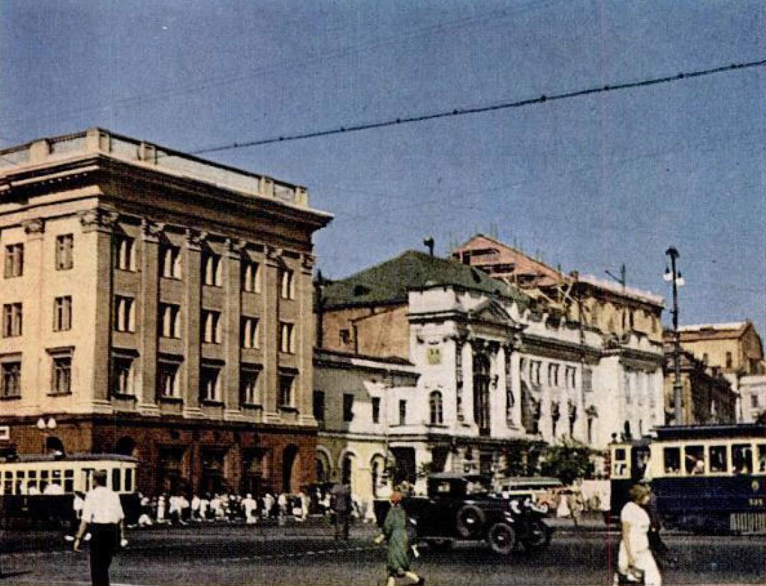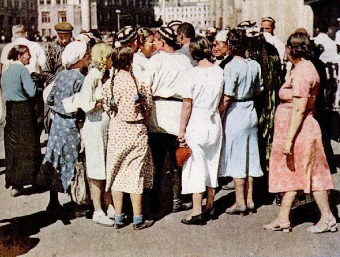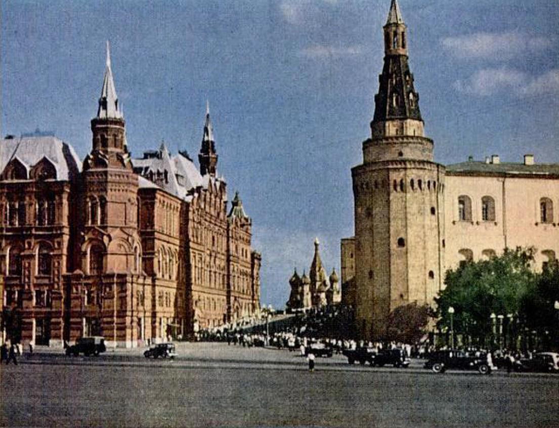 На этой фотографии вы смотрите на южную часть Красной площади, древнее название которой “Красная” в древнерусском языке является синонимом слова “красивая”. Некогда обнесенная широкими стенами рыночная площадь средневековой Москвы, теперь это священное место коммунизма. Перемещая здания и перенаправляя движение, Советы превратили его в место проведения парадов и зрелищ, подобных тому, что происходит выше. В центре картины возвышаются гротескные и разноцветные купола собора Василия Блаженного, за которыми простирается прозаическая Москва. За пределами фото, справа - Кремль и мавзолей из красного мрамора, где до войны. забальзамированное тело Ленина лежало в нетленном состоянии.