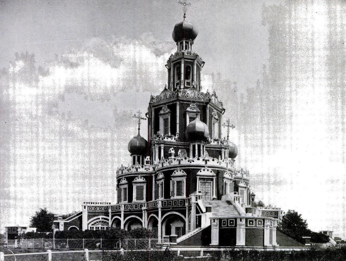 ЦЕРКОВЬ 17 ВЕКА В ФИЛИ, НЕДАЛЕКО ОТ МОСКВЫ, ЯВЛЯЕТСЯ ПРЕКРАСНЫМ ПРИМЕРОМ ПЕРИОДА БАРОККО, КОГДА АМБИЦИОЗНЫЕ АРХИТЕКТОРЫ ЛЮБИЛИ ОШТУКАТУРИВАТЬ ЗДАНИЯ ПРЯНИЧНЫМИ УКРАШЕНИЯМИ