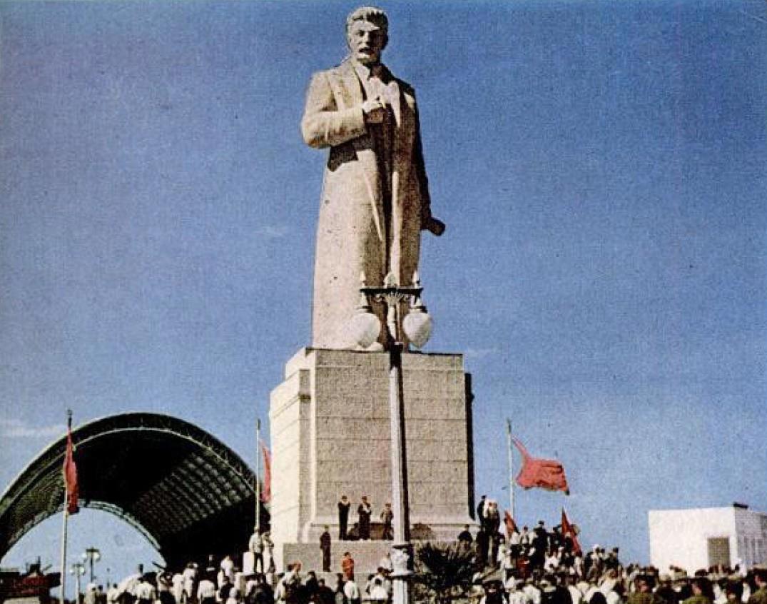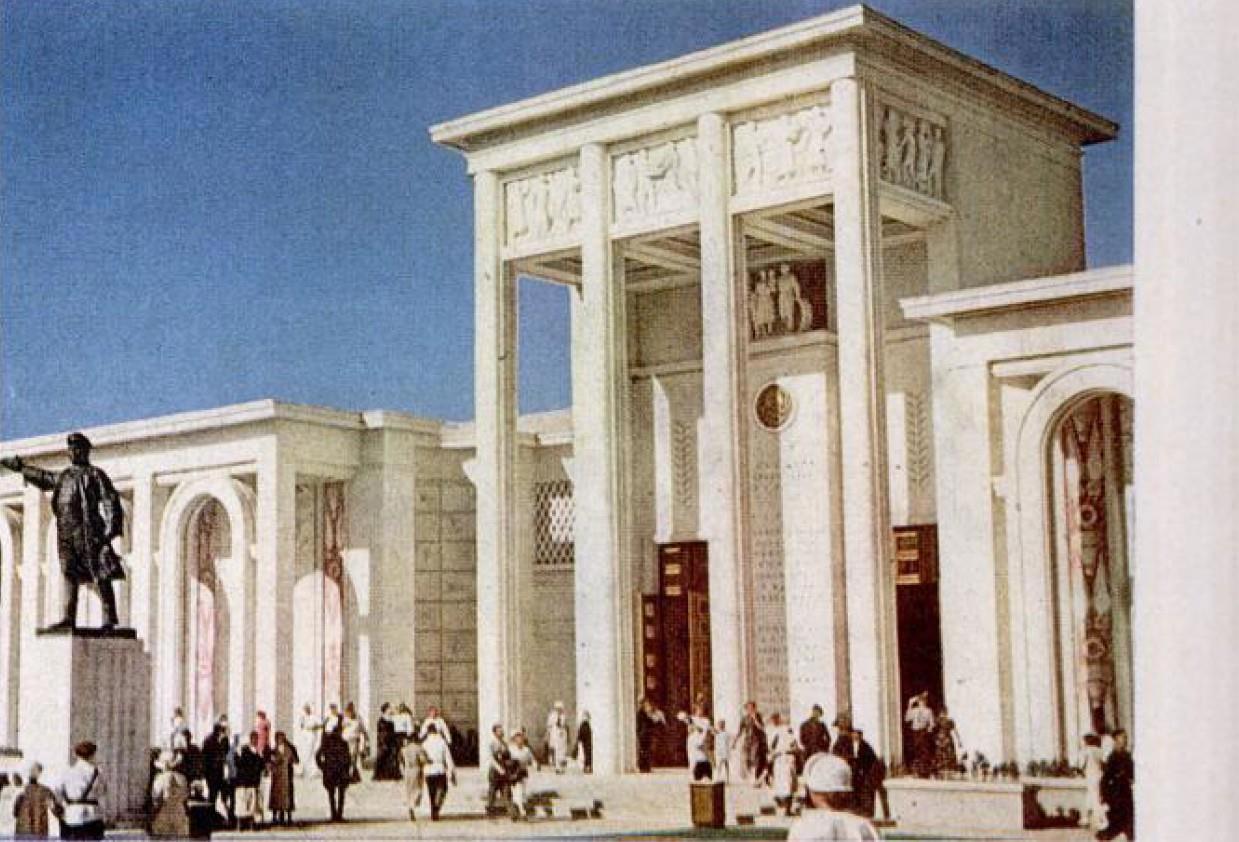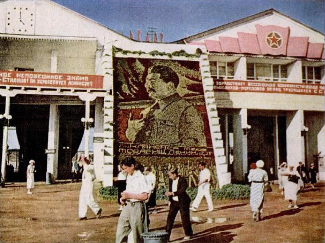 СТАЛИН, скопированный со статуи Меркурова на берегу канала Москва-Волга, стоит на сельскохозяйственной выставке в Москве перед похожим на ангар залом сельскохозяйственных машин.