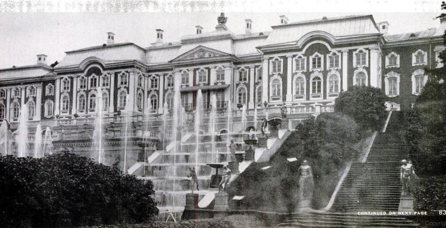 В какой-то мере сердце и историю нации можно прочесть в ее архитектуре. Таким образом, церковь в стиле барокко (вверху) более ярко, чем печатные слова, передает господство и мистицизм установленной церкви в старой России. А дворец Петергоф (внизу) в своем каменном великолепии отражает европейскую элегантность, которую Петр Великий привез из западного мира два столетия назад.