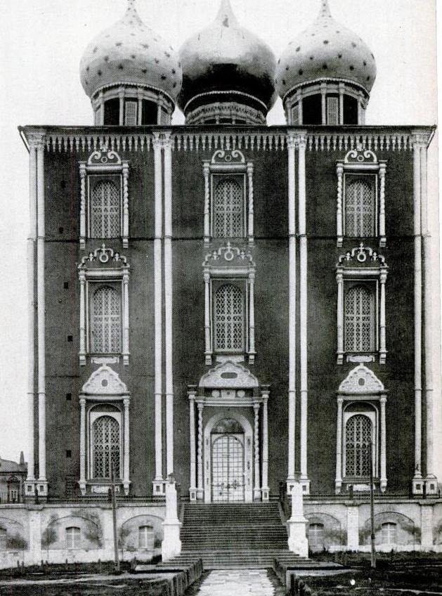 Собор в Рязани, характерное произведение московской школы архитектуры второй половины 17 века, отличается луковицеобразными куполами и вычурным орнаментом.