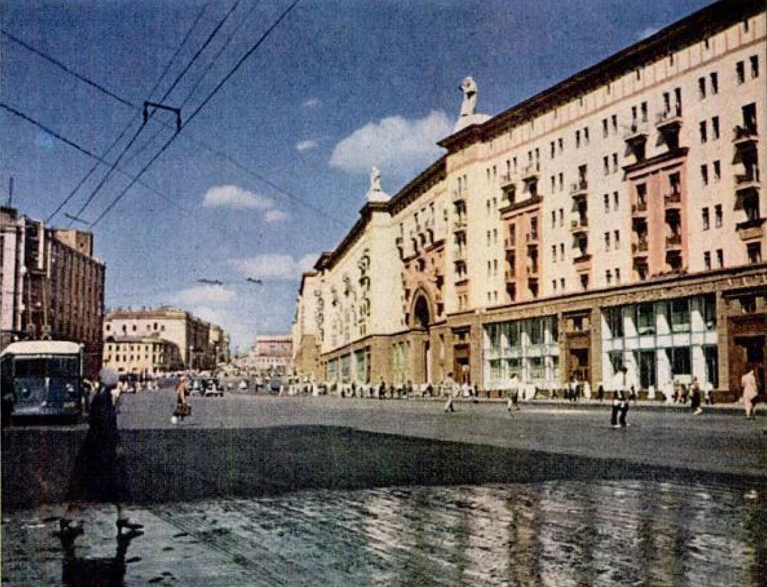 УЛИЦА Горького, самая красивая в Москве, отражающая зелень после дождя. изображены почти все мужчины в рубашках с короткими рукавами. Справа находятся магазины лекарств, одежды, сыра, вина, мороженого.