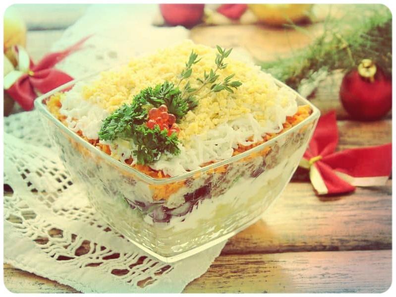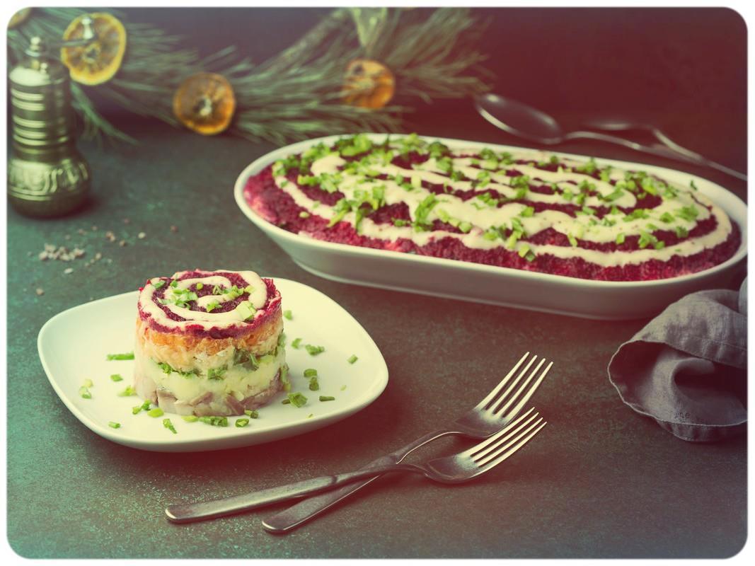 Еще один слоеный шедевр, обильно смазанный сами-знаете-чем. Обязательными ингредиентами являются селедка, свекла и картофель, опционально дополняются вареными яйцами, яблоком и морковью. Одно только сочетание соленой рыбы и свеклы наталкивает на мысли о праздничном суициде под мелодию из «Иронии Судьбы».