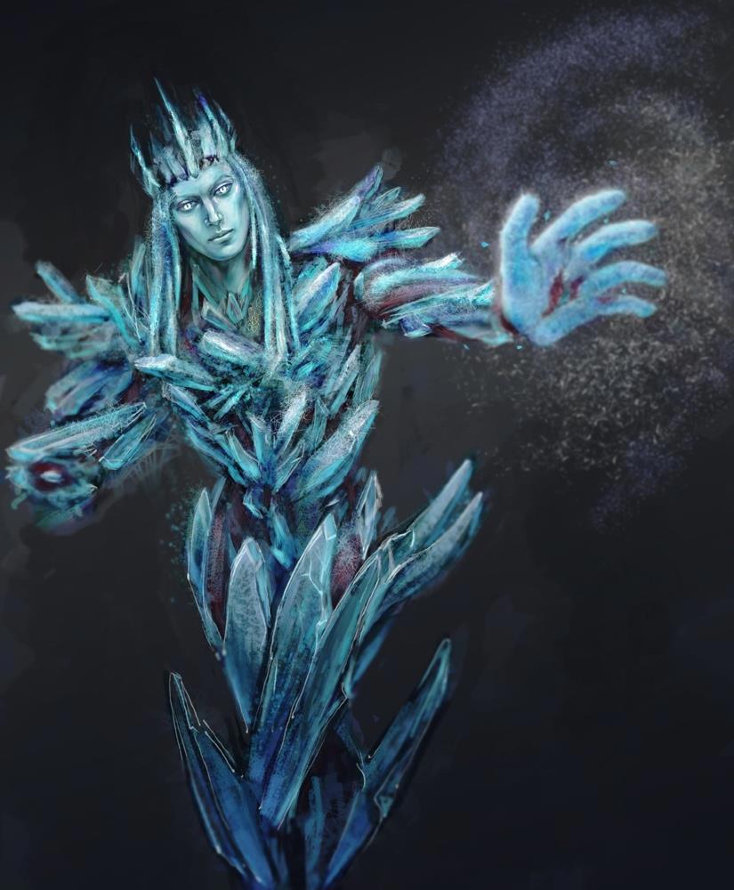Он весь был словно каким-то перекрученным, как будто наполовину освежёванным, наполовину обмороженным, суставы изгибались под неестественными углами, кое-где прямо на мышцы и сухожилия нарос лёд. Левая половина тела дрожала и расплывалась, как будто это существо было ещё не окончательно здесь. В правой руке он волок за собой меч, похожий то ли на сталагмит, то ли на обломок хрустальной друзы.