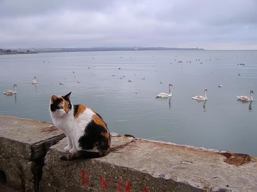 Зимняя пёстрая кошка и лебеди. Тихий-тихий день без ветра. Снимок февральский, зимой у нас бывают водоплавающие гости, которым у набережной, в акватории городской бухты очень даже неплохо. Горожане толпами приходят "покормить птичек", а птички не меньшими толпами этому весьма рады. Набережные коты и кошки тоже внакладе не остаются.