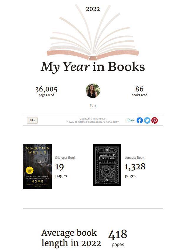 На АТ за 2022 год я прочитала 41 книгу. Это 608 а.л. (да, я считала. Не спрашивайте). Внимательный читатель может сложить два и два и обнаружить, что 86+41=127, а не 119, но некоторые книги есть и на АТ, и на Goodreads, а потому их я дважды не считала. Нечестно вышло бы.