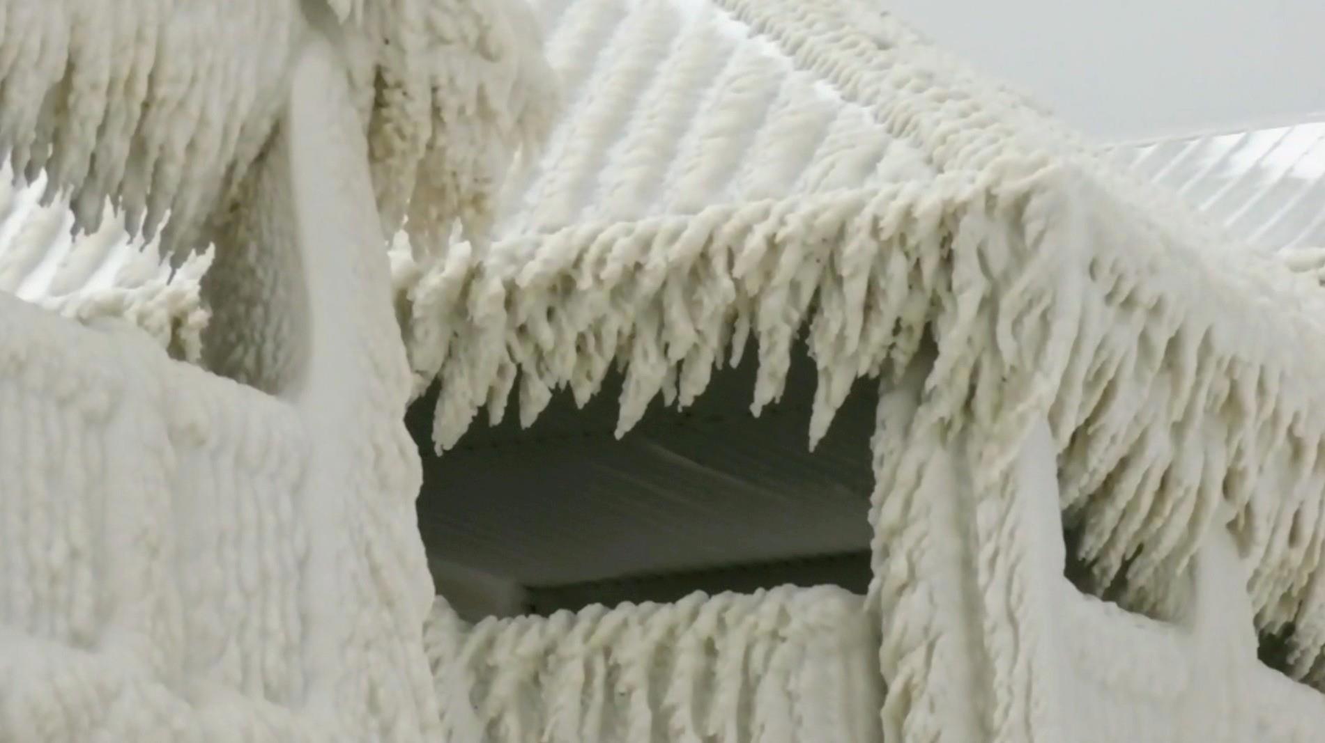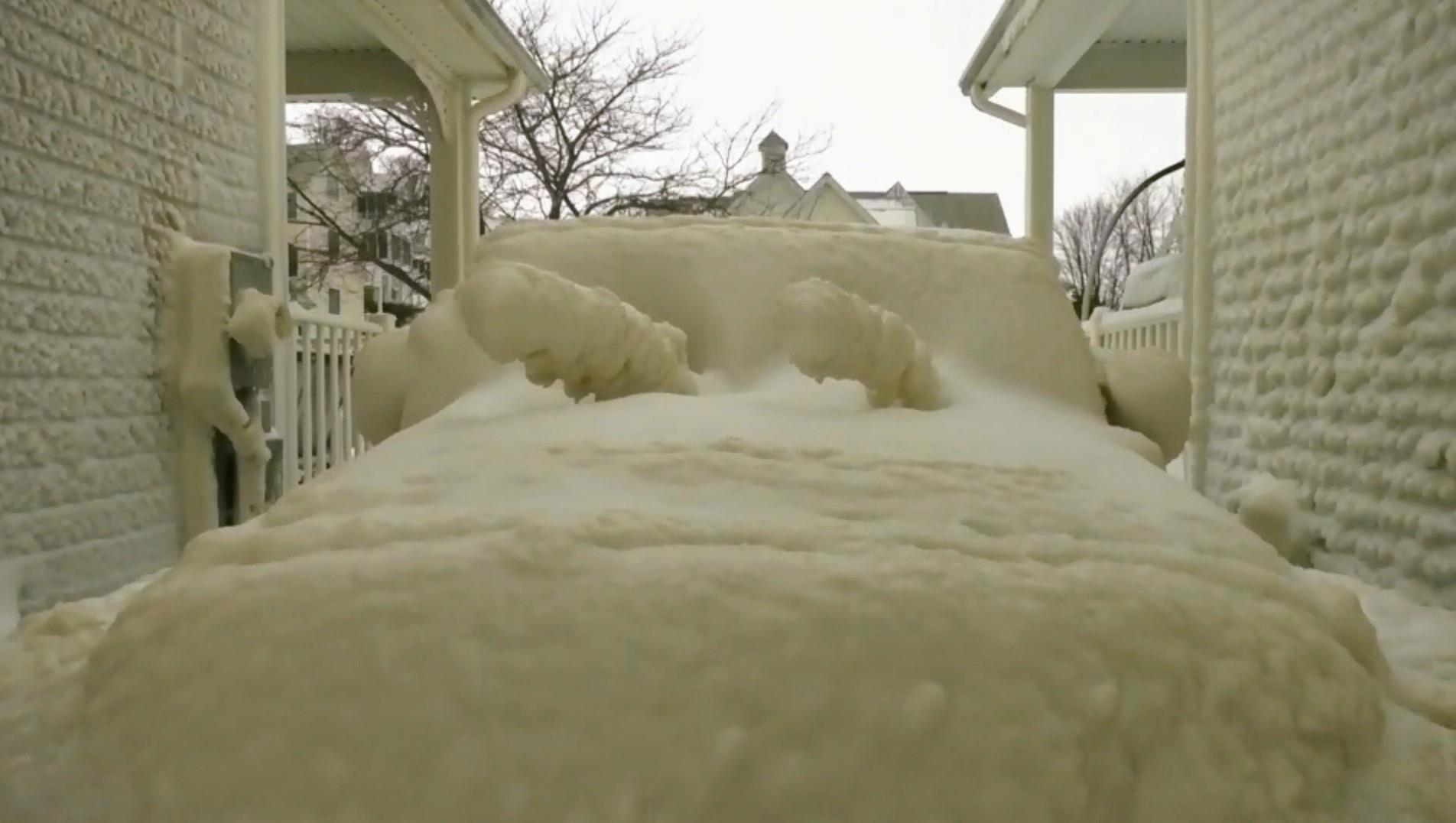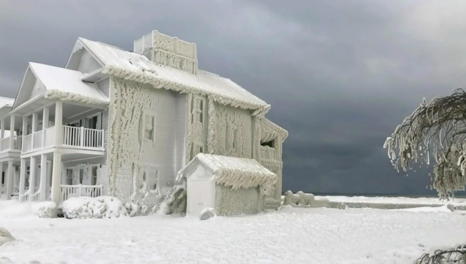 Сильный Ураган залил дома, а мороз их тут же заморозил.
