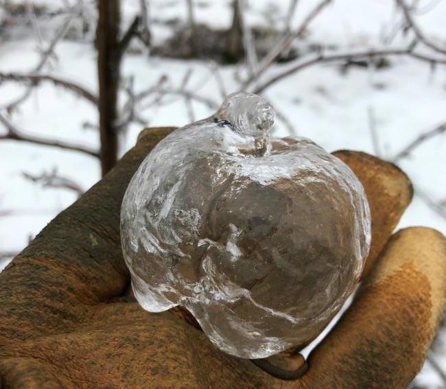Я об этом первый раз здесь услышал. Яблоко покрывается корочкой льда. Превращается в жидкость и вытекает из ледяной оболочки, ко орая и остаётся.