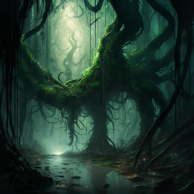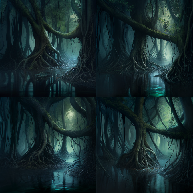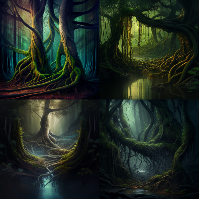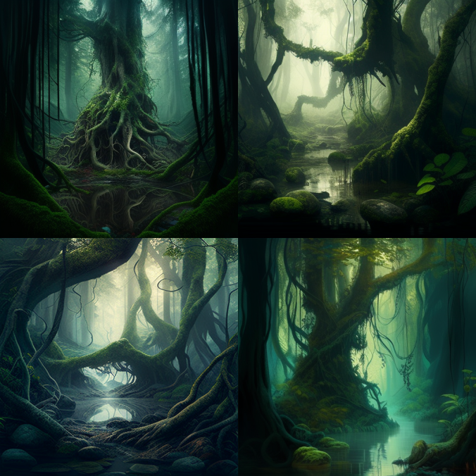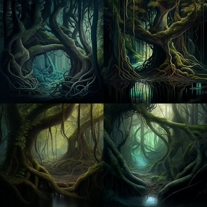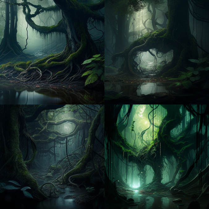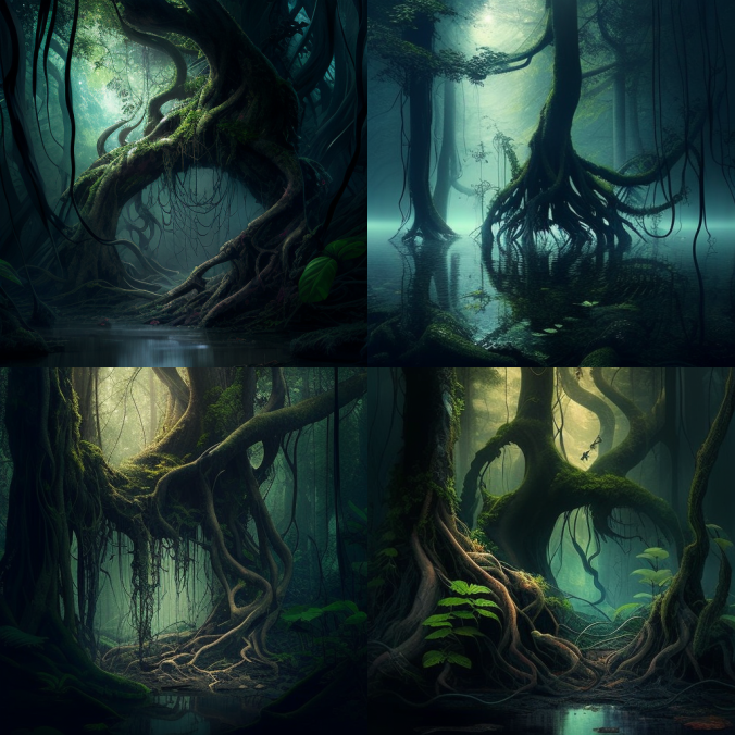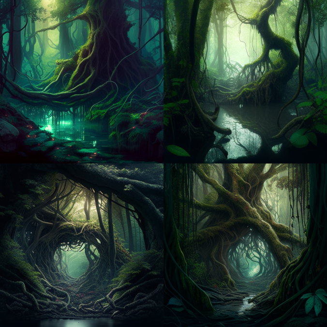 Первая попытка, с такими вводными - intertwined forest, tree trunks, creepers, water vapor, dim light - дала вот такой результат:
