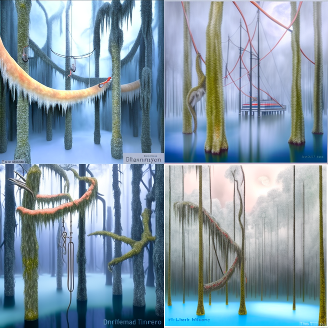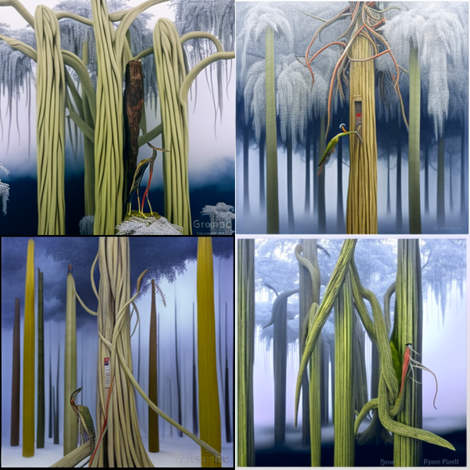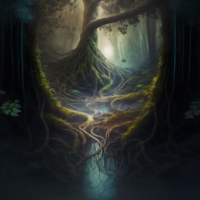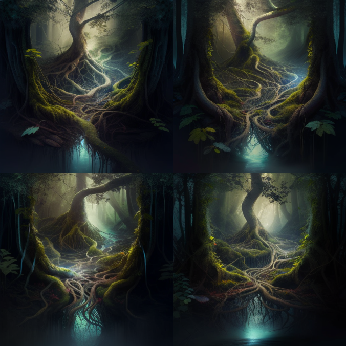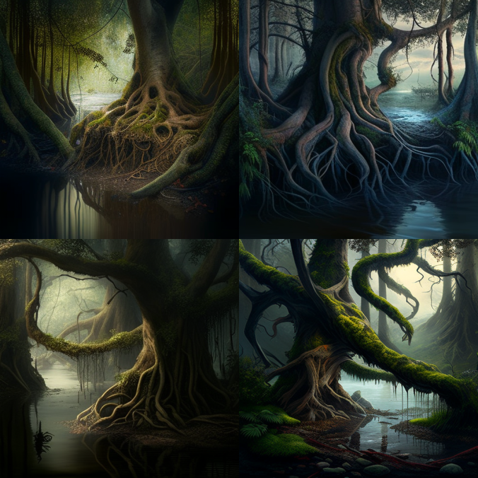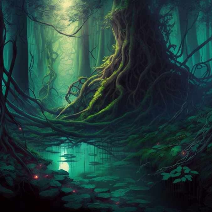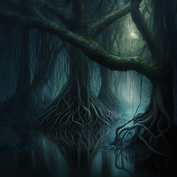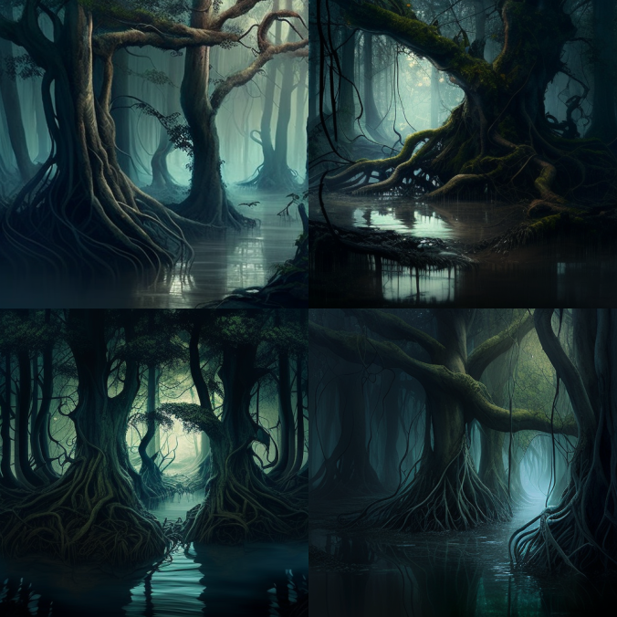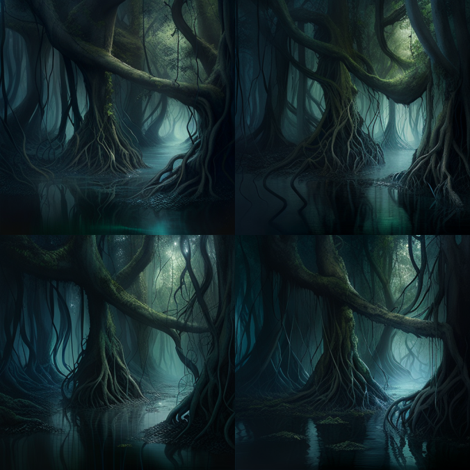 Первая попытка, с такими вводными - intertwined forest, tree trunks, creepers, water vapor, dim light - дала вот такой результат: