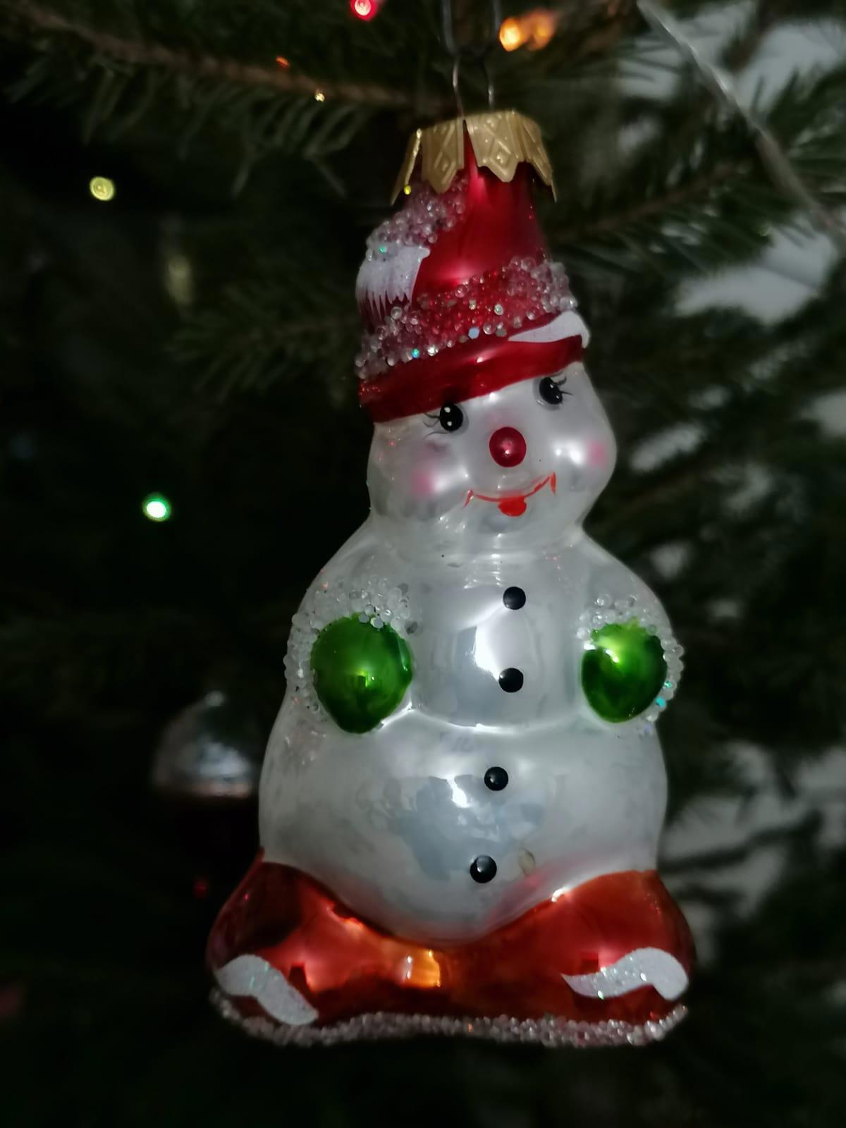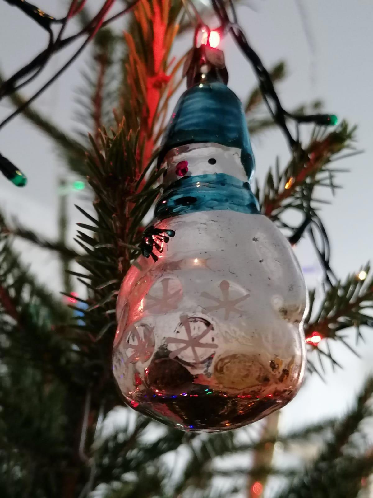 А вот два снеговика. ОДин родительский. ВТорой куплен в прошлом году. Решили с женой каждый год покупать новую стеклянную игрушку. Оба не любим пластиковые. Пластик только по низу для мейн-кунов. Елку коты не трогают. А вот мишуру жрут и нижние игрушки снимают в футбол поиграть. Мишуру вешать перестали. Потом она у них долго из попы торчит. ВРедно для организма. И опасно.