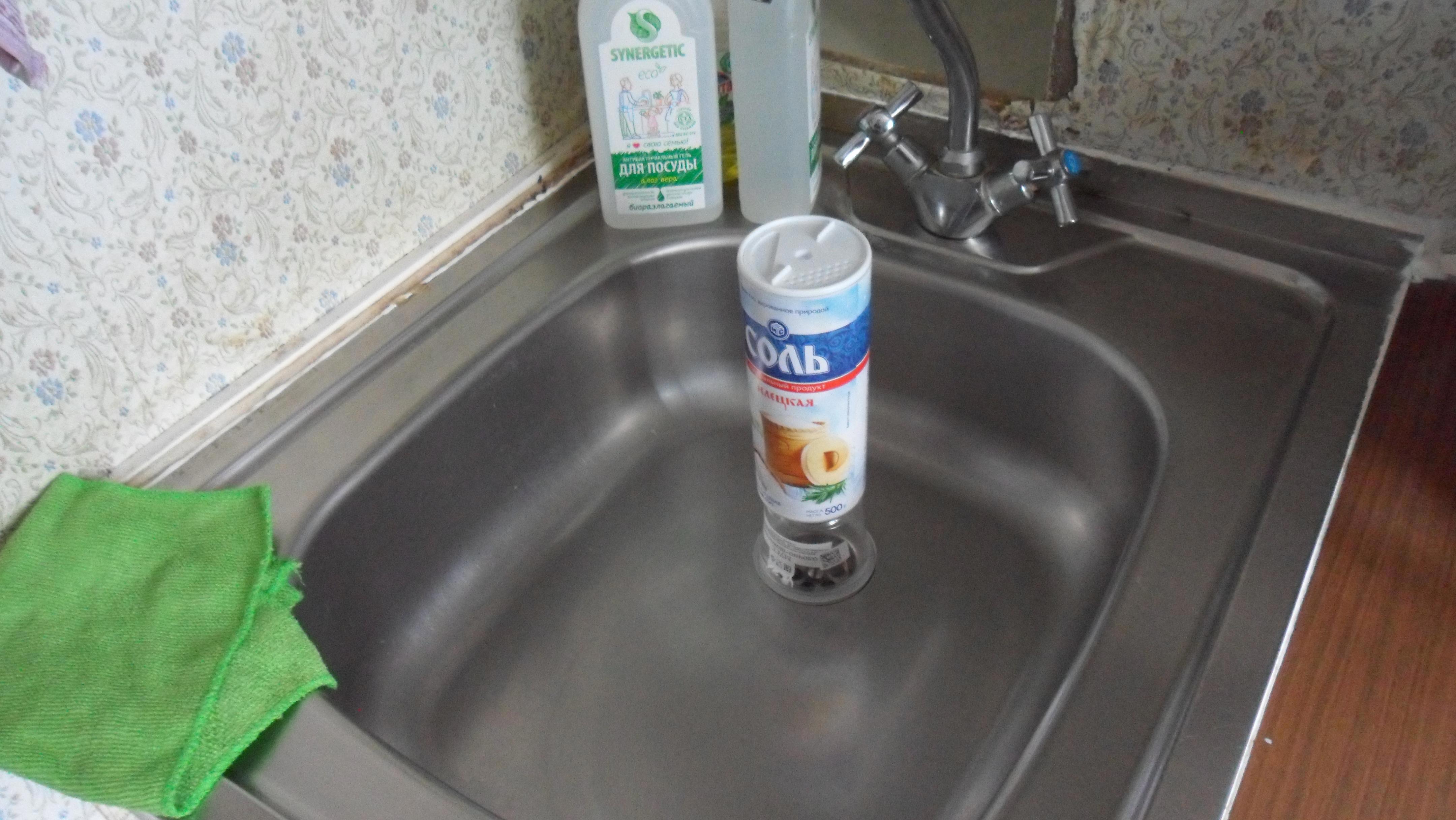 Поэтому каждый вечер, перед тем, как лечь, нужно убрать из раковины решётки, а саму раковину вымыть и тщательно вытереть. В выходные, когда в доме кто-нибудь есть, делать этого не обязательно, но в будни, перед тем, как уйти на работу, точно так же, вымыть и насухо вытереть раковину. И, разумеется, не забыть закрыть отверстие слива. Первое время заклеивал её скотчем, но затем приспособился, накрывать её пустой коробочкой из-под вафельно-шоколадного мусса, а сверху, для плотности ставить банку с солью.
