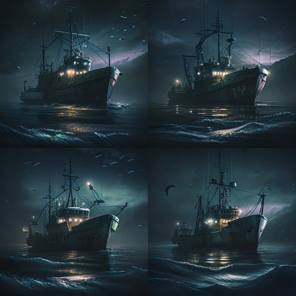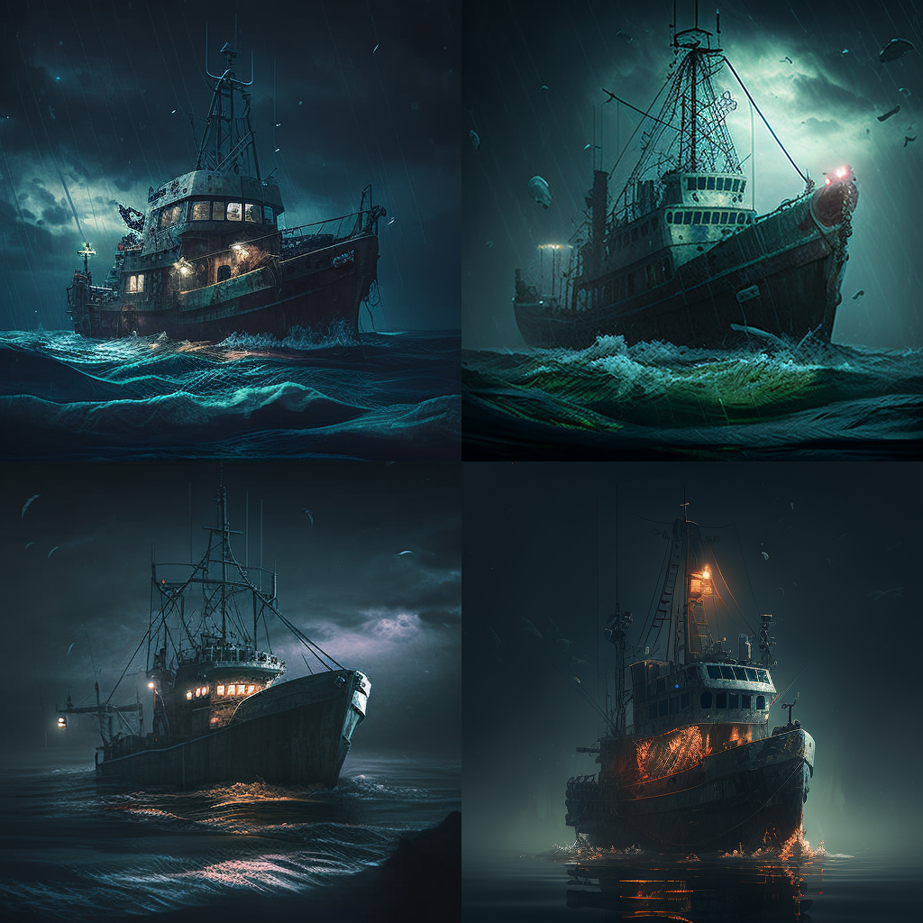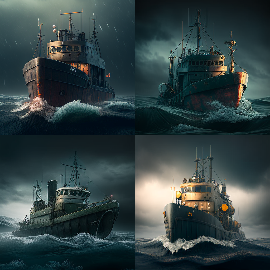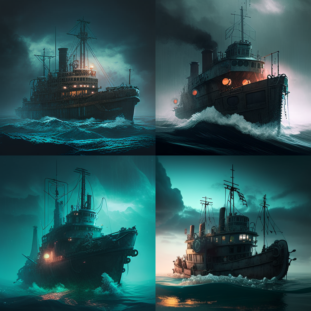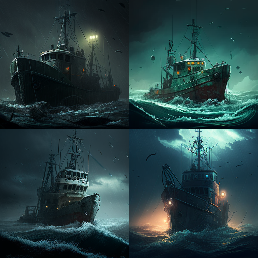 На днях запряг я ИИ (ИскИна, AI) - и буквально за десять минут нейросеть Midjourney наштамповала мне картинок, чтоб изобразить рыболовный траулер в постапокалиптическом море из новой книги Земля заката (Черный день-9).