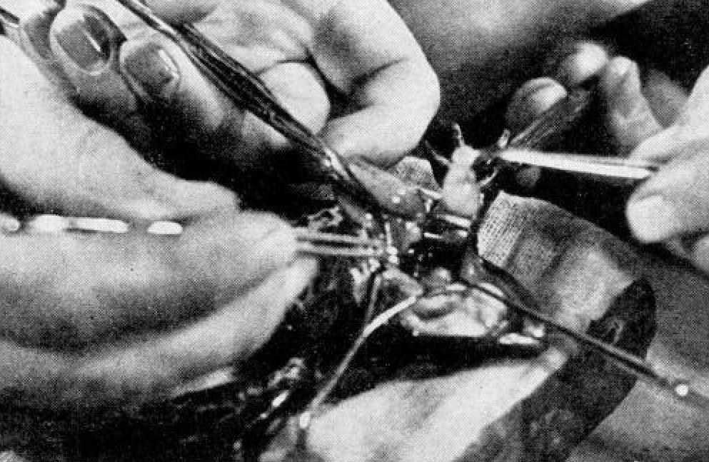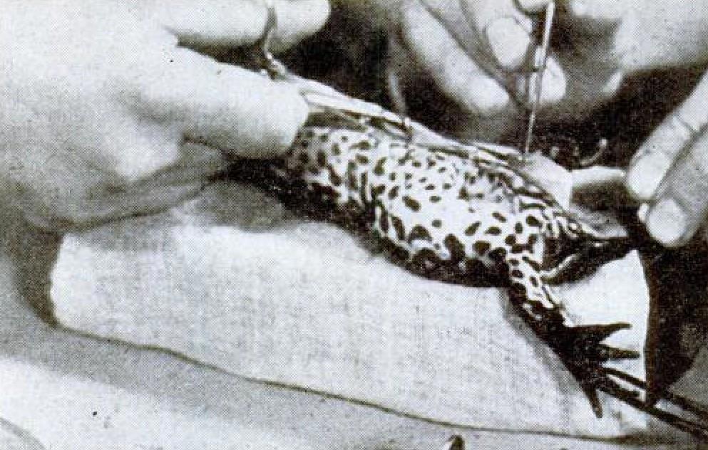 ОПЕРАЦИЯ с ЛЯГУШКОЙ начинается с того, что лягушка вытягивается на спине. Нижняя челюсть удерживается зажимом, чтобы Синицын мог работать через вместительный рот.