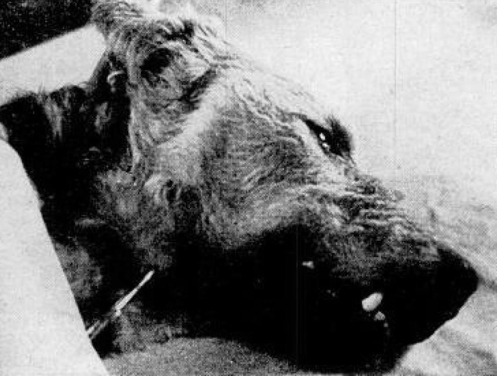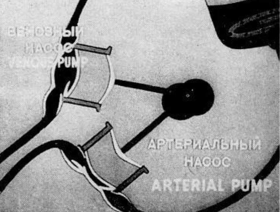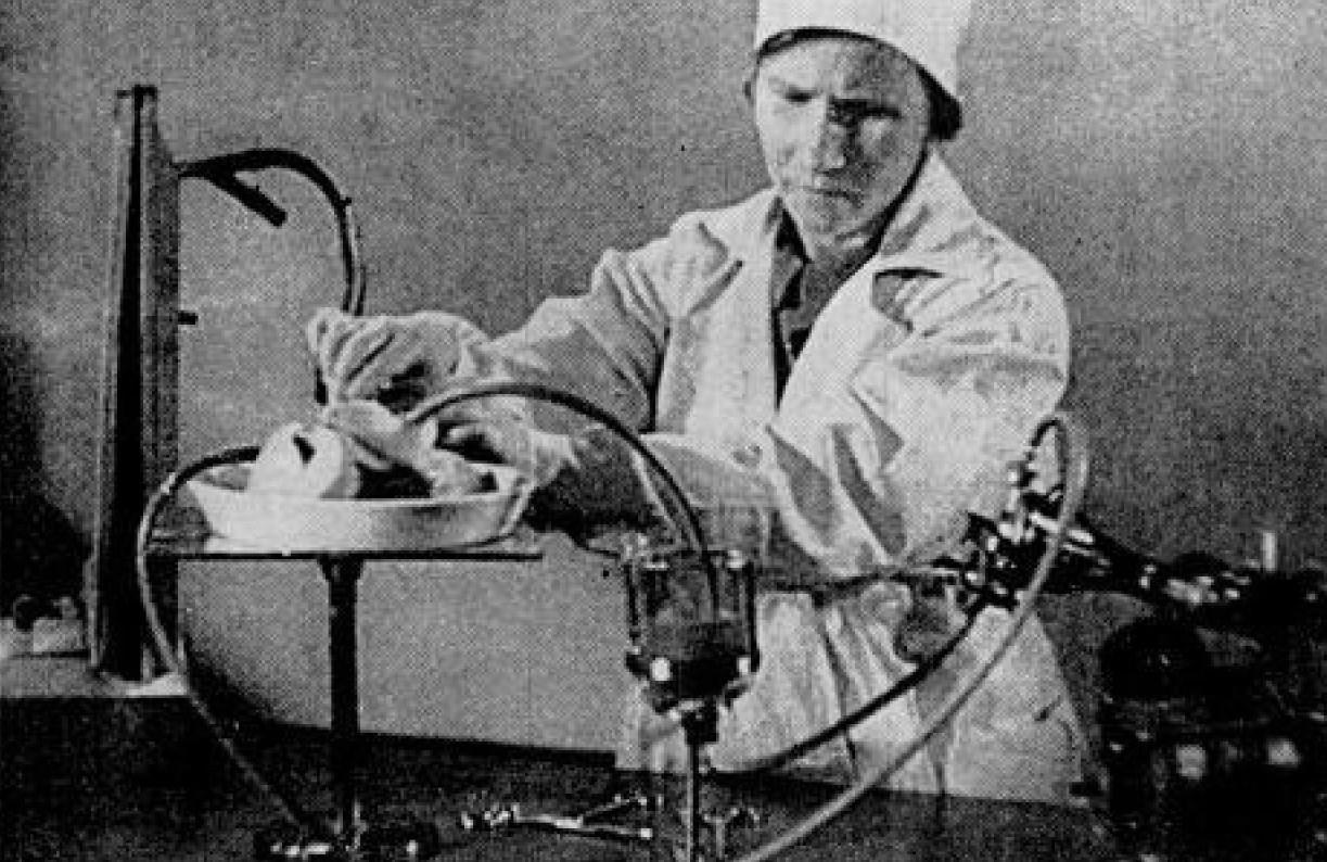 Голова собаки, отделенная от тела, поддерживается живой в течение нескольких часов с помощью автожектора, который поддерживает обмен веществ и кровообращение с помощью трубок, расположенных справа.