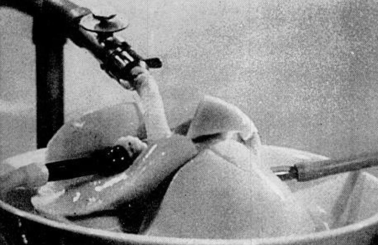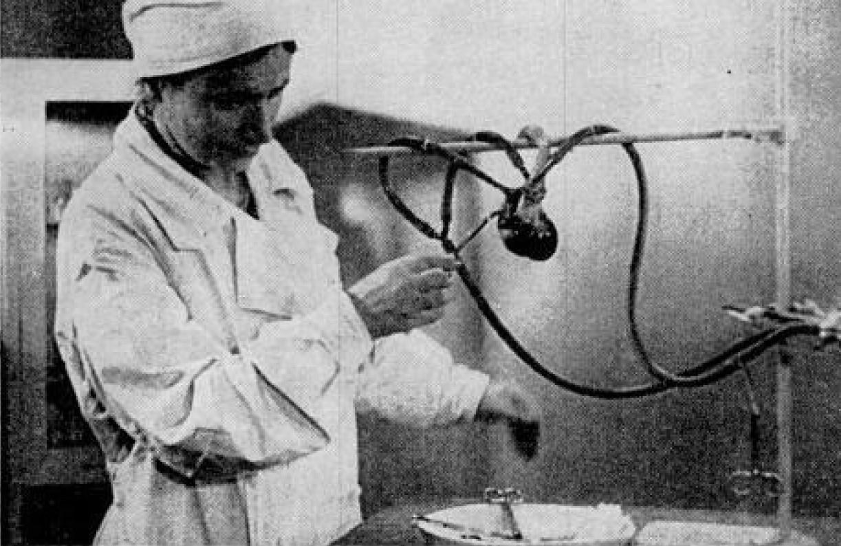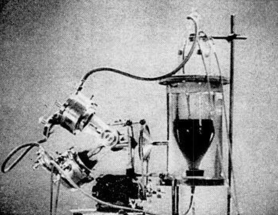 Автожектор - это механическое сердце и легкие. В стеклянном резервуаре, "легком’ машины, кровь собаки насыщается кислородом.