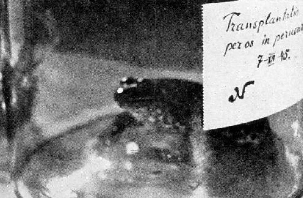 Этот эксперимент был проведен в Институте экспериментальной физиологии и терапии СССР в Воронеже под руководством доктора С.С. Брюхоненко. Будучи достижением в области чистого исследования, она глубоко проникает в вопросы, которые до сих пор были областью метафизики. В клинической медицине это имеет непосредственное значение. С помощью таких экспериментов советские ученые впервые создали систему хранения крови, разделения плазмы и переливания, которая спасла бесчисленное множество жизней в этой войне. Возрождение всего организма завершило длинную серию экспериментов по реанимации отдельных органов, сердца, легких и даже мозга, которые показаны на следующих страницах.