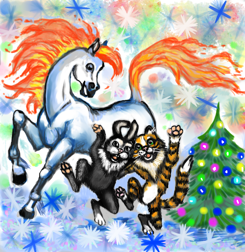 Здоровья, счастья, вдохновения и мира! Этот год богат зверушками. По китайскому календарю 2023 год чёрного кролика или кота. А по славянскому календарю наступил год огнегривого коня.