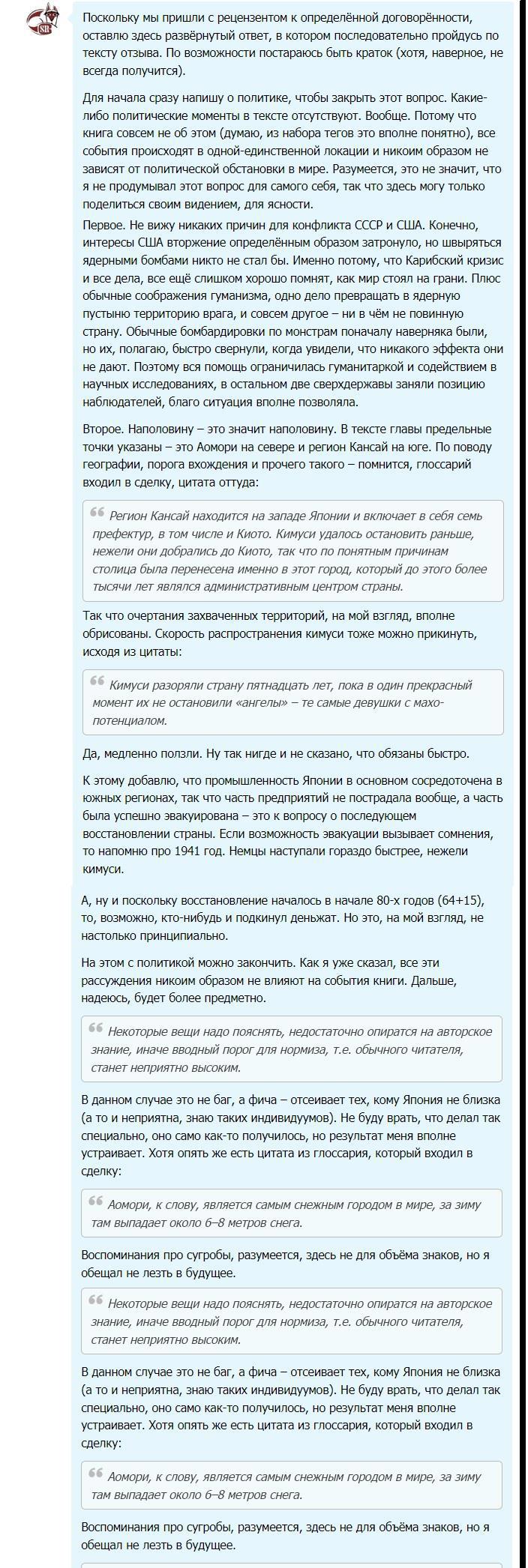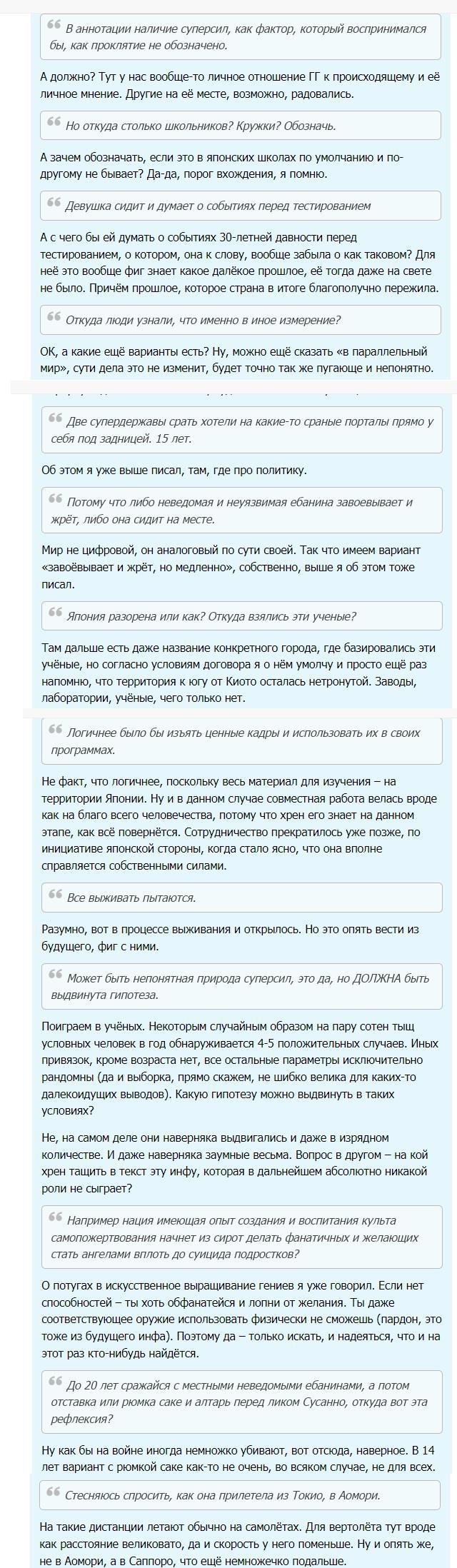 Но вот у нас, в мире где Японию в 60-х едва не сожрали некие монстры из портала, и где одно это событие должно было привести к усилению тоталитаризма (который Япония шестидесятых хорошо помнила), и в целом иной парадигме мышления, ГГ настолько особенная, что забывает про процедуру, от которой в теории должно зависеть её будущее.