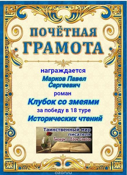 Автор: Павел МарковДрузья, помните конкурс «Исторических чтений», который проходил в ВК? Я тогда еще скромненько попросил вас поддержать мою книжечку, если вы ее действительно считаете достойной... Клубок со змеями выиграл! Совершенно неожиданно для меня.