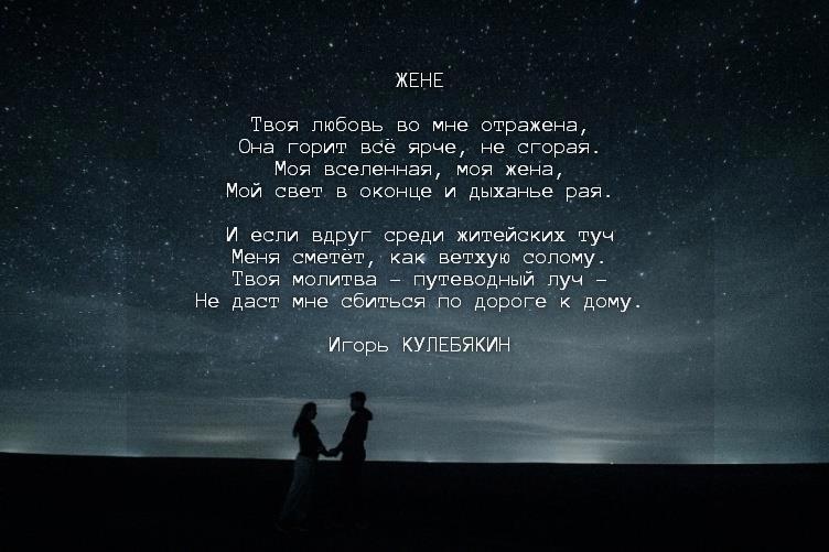 Игорь) порадовали признанием в любви к жене)), а не к проходившей мимо молодой особе))) Спасибо, что даёте веру, что мужчина способен на долгие, глубокие чувства)))