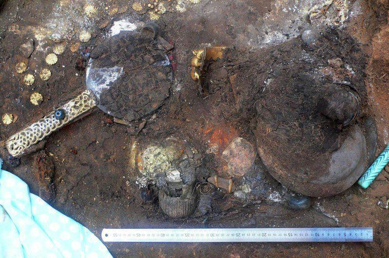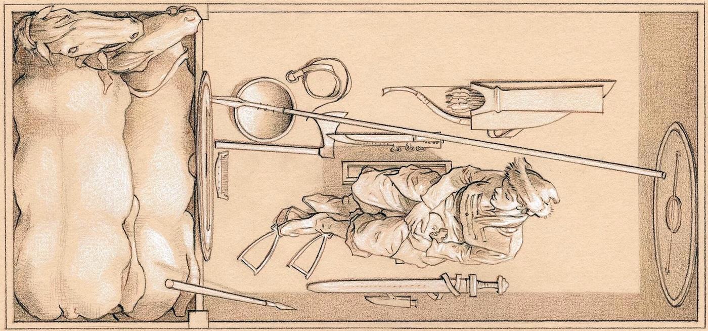 В Европе с амазонками дела обстояли плохо. Но есть исключения. Любопытный случай произошёл в Швеции. В далёком 1878 году там была обнаружена могила воина. Всё вроде было нормально: скелет, меч в ножнах, топор, нож, два копья, два щита, колчан с 25 стрелами, сумка с фигурками от игры и два коня. Может они нашим амазонкам позавидовали, а может и по другой причине, но в 2017 году было принято решение о проведении генетического анализа знатного воина. Оказалось – женщина. Вот схема захоронения: