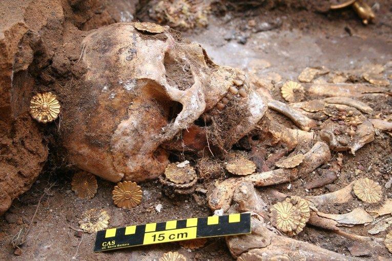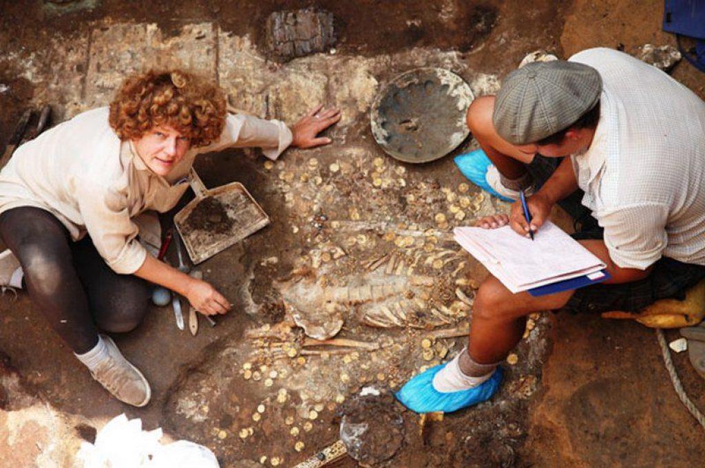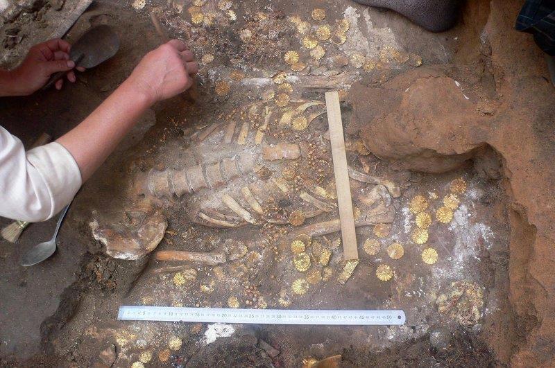 В 2013 году под Оренбургом под руководством Леонида Яблонского в Филипповском кургане откопали нетронутое женское захоронение 4-5 века до н.э., которое можно вполне назвать «Золотой женщиной». Кто мог не полениться насыпать огроменный курган и похоронить в нём женщину с кучей золотых украшений? Ну – «кочевники», разумеется, кто же ещё? Только они имели страсть возить на себе тяжеленные груды золотых украшений. Так им было легче кочевать. А чтобы совсем было легко в походе, они возили с собой котёл, сделанный по очень сложной технологии и весом около полутонны, который положили в могилу женщин-воина. Всё сохранилось очень хорошо. Вот фотографии с раскопок:
