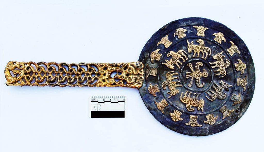 Вот отдельно бронзовое зеркальце, инкрустированное золотом этой воительницы: