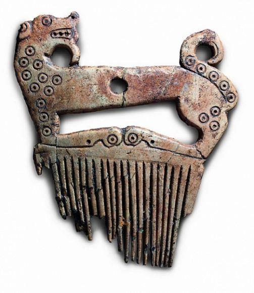 Набор вещей тоже интересный. Это два железных дротика, 30 бронзовых наконечников для стрел, а к ним золотые серьги, бусы, бронзовое зеркало и пр. Среди прочего очень интересный гребешок с фигуркой гепарда (изображение этого зверя у скифов и сарматов – редкость). Вот этот: