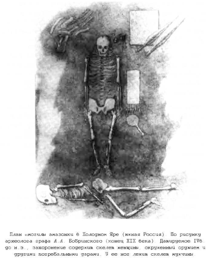Чтобы не сложилось впечатление, что это всё является какой-то особой новостью, вспомним графа А.А. Бобринского, который раскапывая в конце 19 века курганы в районе Смилы на Украине первым понял, что большинство весьма воинственных захоронений являются женскими. Одно из первых раскопанных захоронений оказалось парным. В нём оказалась женщина с кучей бытовых предметов, украшений и оружия, а у её ног был похоронен мужчина (слуга?). Около него оружия не было. Вот схема этого захоронения: