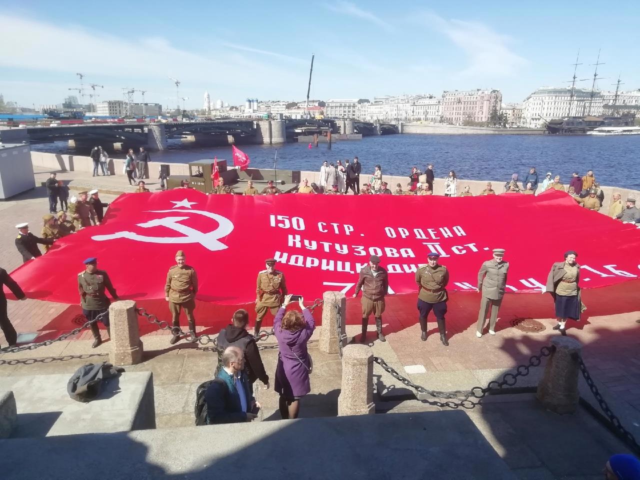 Май и автопробег "Машины Победы" в Питере. Развертывание Знамени Победы на стрелке Васильевского Острова: