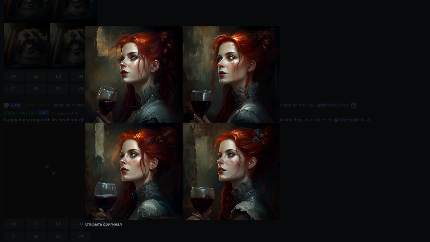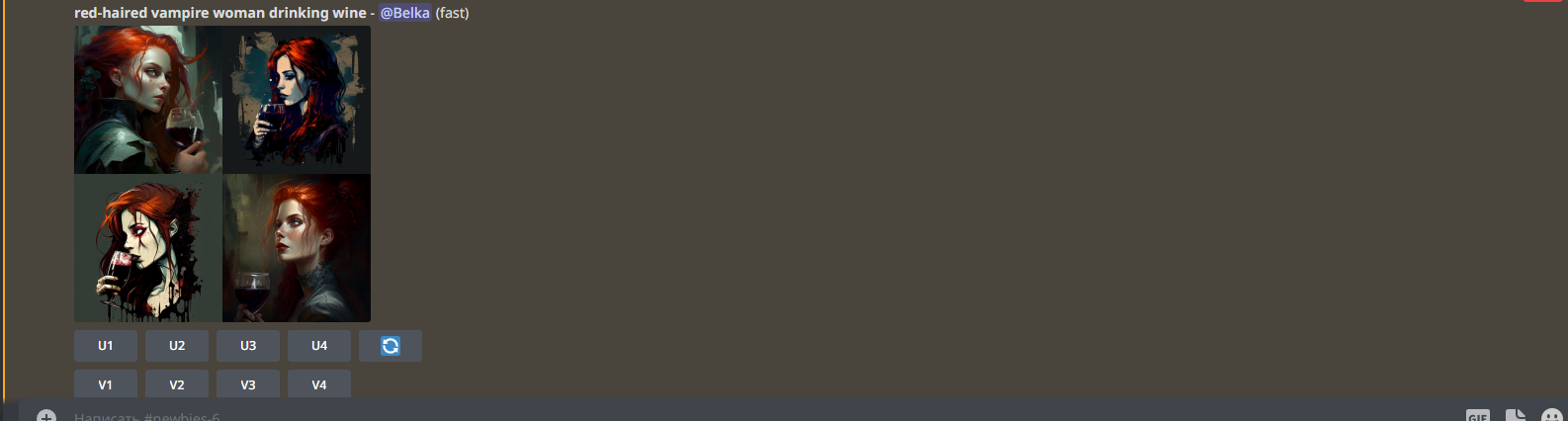 10. Снова вводим /imagine и прописываем нужные слова: red-haired vampire woman drinking wine