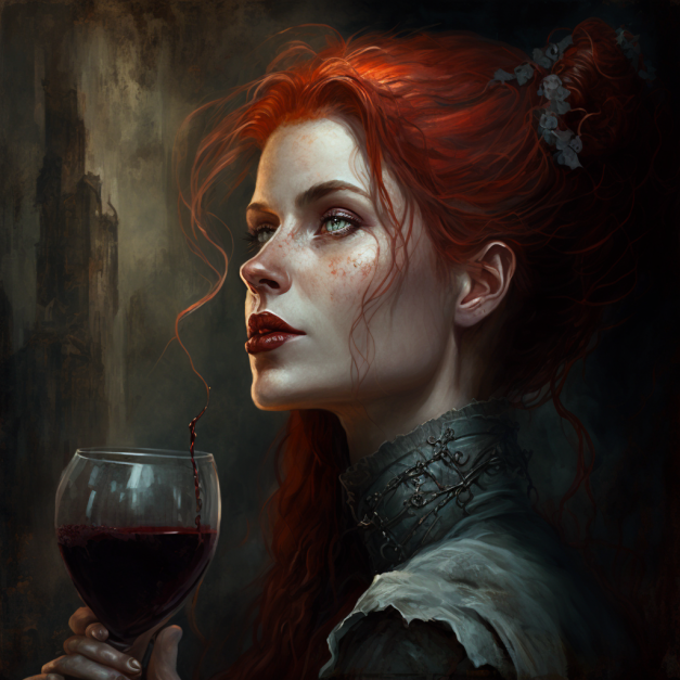 Пример: red-haired vampire woman drinking wine