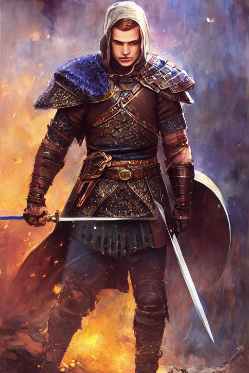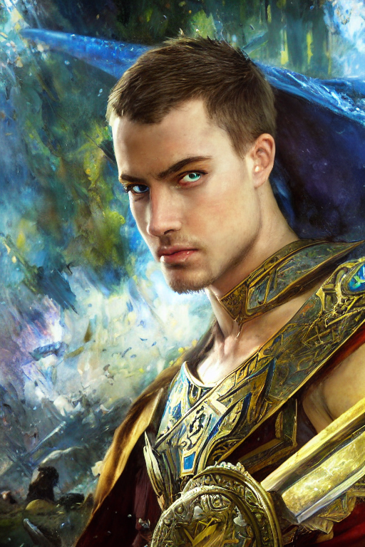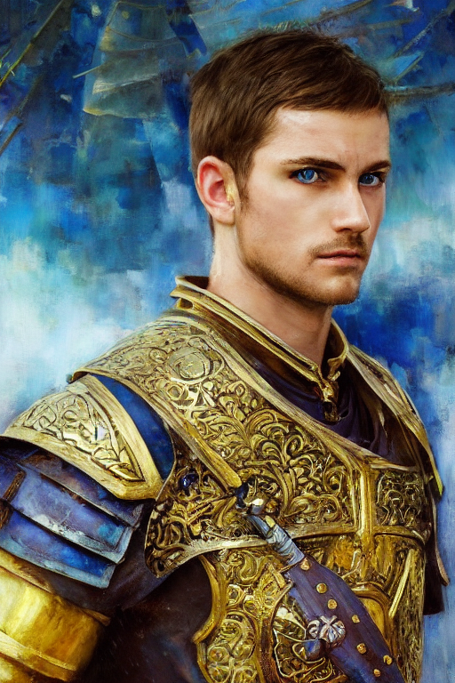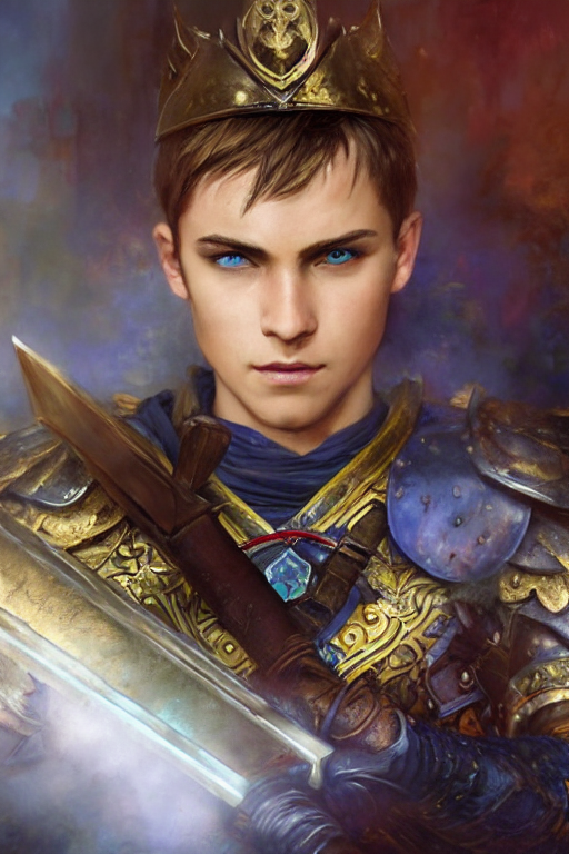 Вот, например, я вбила подсказку young man, detailed blue eyes, warrior clothes, golden sword, full-size portrait, realistic style, dnd character portrait, intricate, oil on canvas, masterpiece, expert, insanely detailed, 4k resolution, john william waterhouse, agnes cecile, charlie bowater, wassilly kandinsky, composition и плюс ниже негативную подсказку, т. е. «вычет плохого» 2 heads, extra heads, elongated body, 2 faces, cropped image, out of frame, draft, deformed hands, signatures, big hair, twisted fingers, double image, long neck, malformed hands, multiple heads, extra limb, ugly, poorly drawn hands, missing limb, disfigured, cut-off, kitsch, ugly, over- saturated, grain, low-res, Deformed, blurry, bad anatomy, disfigured, poorly drawn face, mutation, mutated, floating limbs, disconnected limbs, out of focus, long body, disgusting, poorly drawn, mutilated, mangled, surreal, extra fingers, duplicate artefacts, morbid, gross proportions, missing arms, mutated hands, mutilated hands, cloned face, maformed limbs, missing legs, signature, watermark, heterochromia.