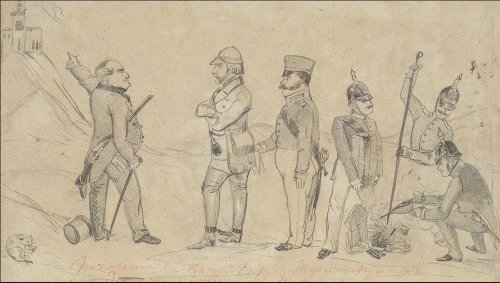 Лев Николаевич Ваксель. Карикатура на арест И. С. Тургенева. Крайний слева — М. Н. Мусин-Пушкин. Он показывает И. С. Тургеневу (второй слева, в ножных кандалах) на острог на горе. Справа трое жандармов сжигают "Записки охотника". В нижнем углу слева — аллегория происходящего, кошка сжимает в лапах соловья. 1852 год.