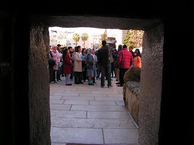 Вход в Храм называется «Врата смирения». Даже мне с моим небольшим ростом пришлось сильно наклоняться. Высота проема всего 120 см. В средние века, для защиты храма от кочевников, имевших привычку заезжать внутрь верхом, вход сделали низким и узким. С тех пор, каждый, входящий, должен склониться перед рожденным здесь Спасителем.