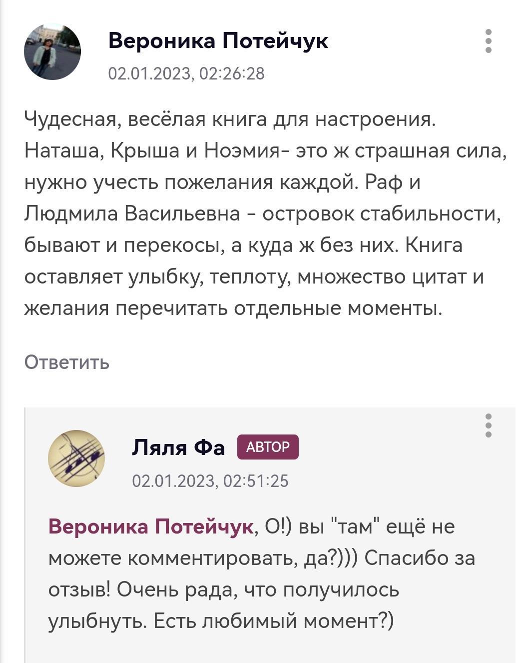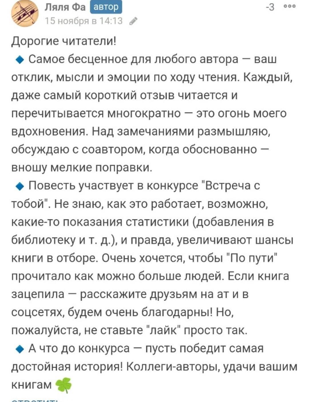 Тем более, что, например, под "По пути" у меня нет отзывов с тех пор, как передумала и стёрла своё заминусованное обращение к читателям. Не учла, что след от удалённого сообщения не исчезает и пугает, по статистике книгу читают практически ежедневно, но отзывов не пишут (((