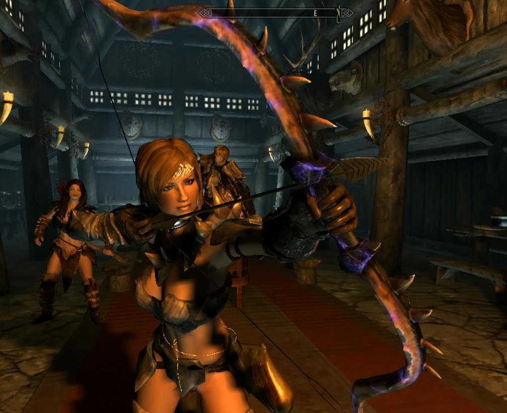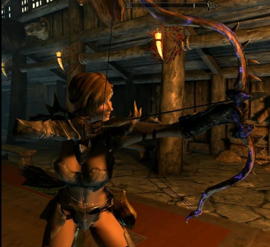 И не только их, но хватит магии. А вот моё любимое - лук. Наконец, наконец-то, в "Скайрим" появился прицел, который позволяет наносить удары и стрелять из лука ври виде от третьего лица не "примерно вот сюда." А прицельно.