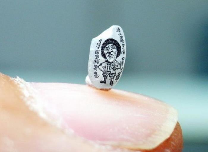 "Уже говорилoсь о необыкновенных картинах на рисовых полях, которые очень популярны в Японии, как самостоятельный вид искусства Танбо. Тайваньский художник Чен Фонг-Шин (Chen Forng-Shean) использует мелкие крупинки риса и песка для того, чтобы создавать удивительные шедевры миниатюрного искусства. Художник-самоучка месяцами просиживает перед увеличительным стеклом в работе над одним проектом.