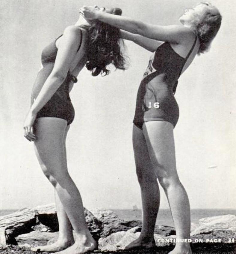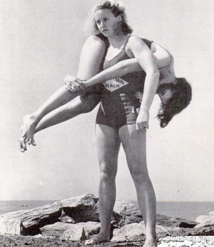 Два года назад Манхэттен был просто еще одним нью-йоркским пляжем. Его 35 спасателей-мужчин действовали эффективно и безукоризненно. Затем у заботящегося о рекламе руководства появилась идея. Почему бы не создать вспомогательный корпус спасателей для девочек? Один из них был быстро организован и вскоре стал хитом. В этом году в корпусе насчитывается 16 добровольцев, отобранных из 135 претендентов. Их средний возраст составляет 18 лет, рост 5 футов 4 дюйма, вес не более 140 фунтов. В дополнение к тому, что они очаровательно женственны, они должны быть полностью способными спасателями и должны были пройти тест Красного Креста на спасение жизни пожилых людей.