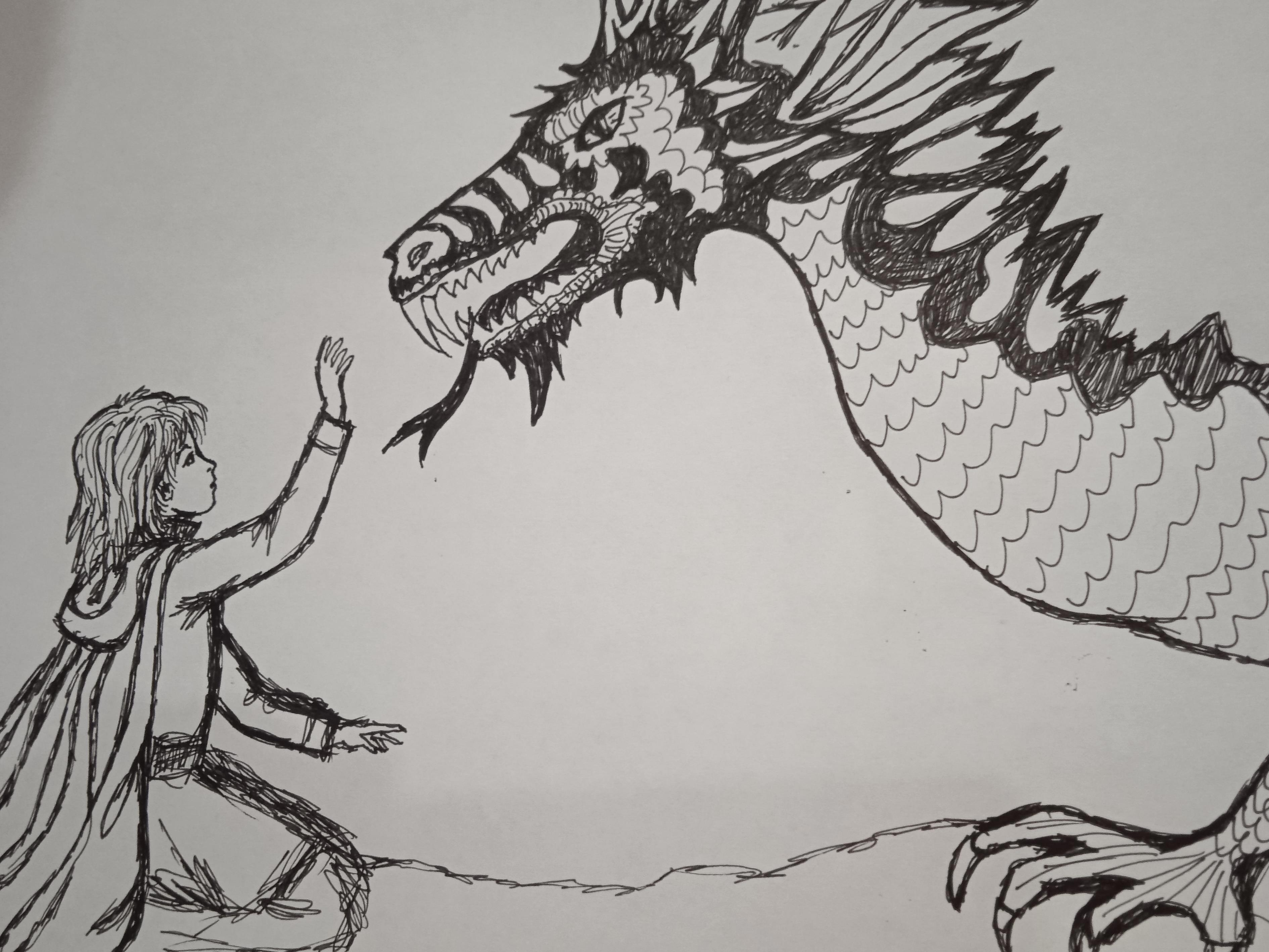 Попробовала сегодня нарисовать змеедракона. Вроде симпатично получилось, но с размером героя человека не рассчитала. Должон быть меньше, мне кажется. А вам как кажется?