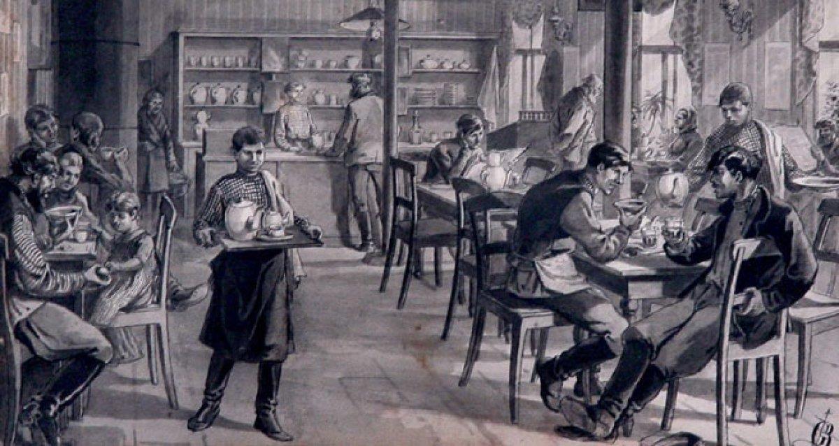 Я зашла. В простом, по-бедняцки оформленном маленьком помещении, оклеенном полосатыми обоями и освещённом керосиновыми лампами по стенам, стояло девять столов, вокруг одного из которых теснился десяток людей, остальные же были свободны. За прилавком томился буфетчик в клетчатой рубашке. На вопрос мой, сколько стоит чай, он сказал, что три копейки порция. Я уселась за свободный столик, стала рыться по карманам… Увы, тщетно! В этот раз таблеточная магия не бросила мне даже алтына.