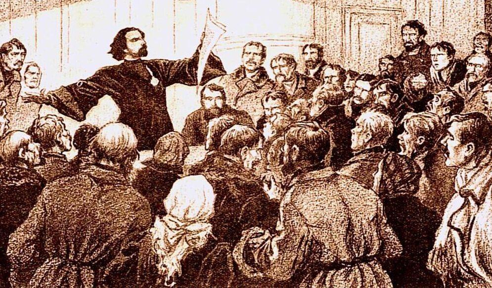— Товарищи! Не поддавайтесь монархической пропаганде! Попы всё врут! Знайте, что пока стоит самодержавие, жизни нашему брату не будет! Не верьте царю! Покупайте газету «Искра»!