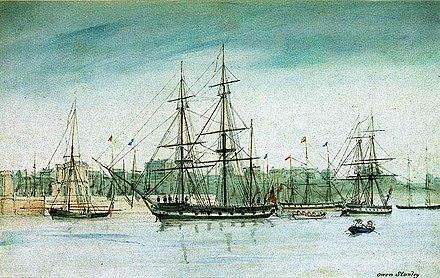 Шлюп «Бигль» (в центре) на акварели Оуэна Стенли, 1841 год, во время своего третьего путешествия близ берегов Австралии