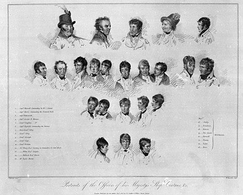 И. Экштейн. Портреты офицеров HMS Centaur, 1805. первый дейтенанти "Кентавра" Джеймс Морис (будущий командир "каменного шлюпа "Даймонд Рок") — в верхнем ряду, второй слева