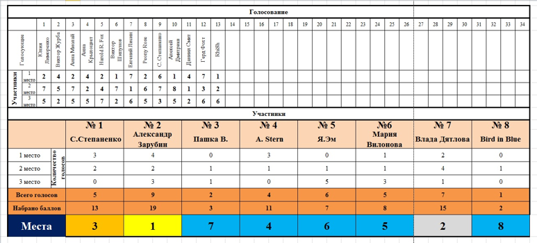 Как сообщалось ранее, фавориты на первое и второе место наметились сразу. И их позиции не изменились. А упорная борьба за третье место разыгралась до самого последнего голоса, который и поставил окончательную точку. Также большое спасибо участнику игры-марафона Алексею Дмитриеву за таблицу с результатами голосования.
