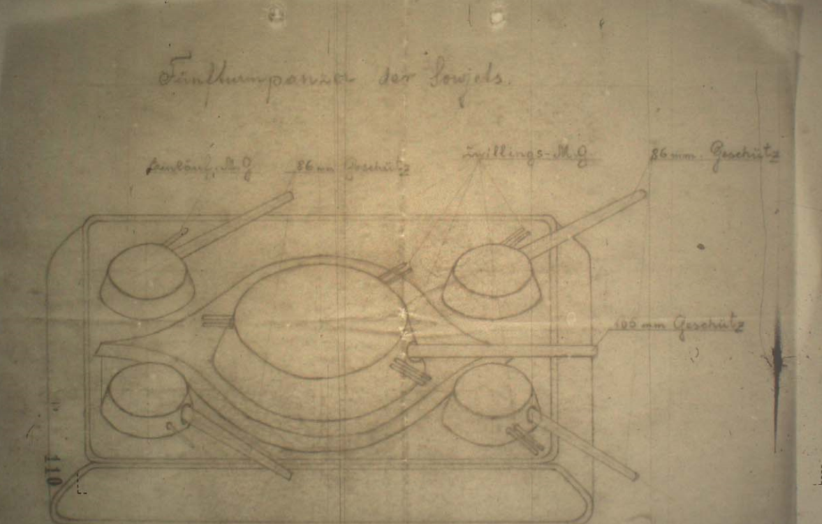 По данным перебежчика танки выглядят так: двухбашенный несколько больше КВ-1, центральная башня овальной формы имеет 78-мм пушку и два спаренных пулемета. На крыше башни находится реактивная установка, сост. из 8 направляющих рельсов. Установка может вращаться на 360 град из башни танка с помощью независимой вращательной системы. Ракеты имеют бронебойные выстрелы.