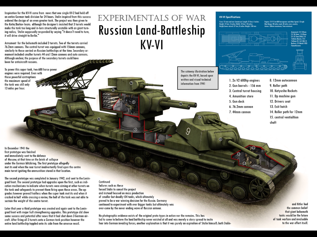 рисунок уже современного фейка — КВ-6 «бегемот» :) «Первый опытный образец был достроен в 1941 году и сразу же был отправлен на защиту Москвы. В первой же бою, который проходил в сильном тумане, задняя башня случайно прострелила среднюю башню».