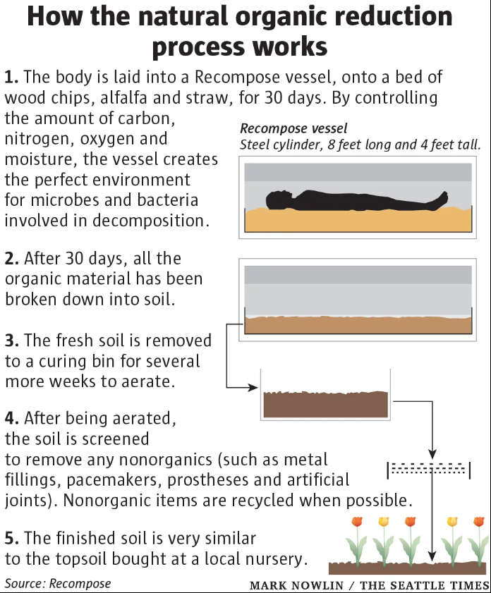 21 мая 2019 года губернатор штата Вашингтон демократ Джей Роберт Инсли подписал закон, который разрешает превращать человеческие останки в компост. Такое решение в США на уровне штата было принято впервые. Лоббистом данного закона стала корпорация Recompose, основанная в 2017 году. Эта организация запатентовала технологический процесс и открыла первое предприятие, на котором из тела умершего примерно за месяц получаются две садовых тачки земли. Семьи покойных могут распорядиться этой землёй так, как посчитают нужным. Recompose предлагает в качества одного из вариантов пожертвовать эту землю для восстановления лесных угодий в штате Вашингтон.