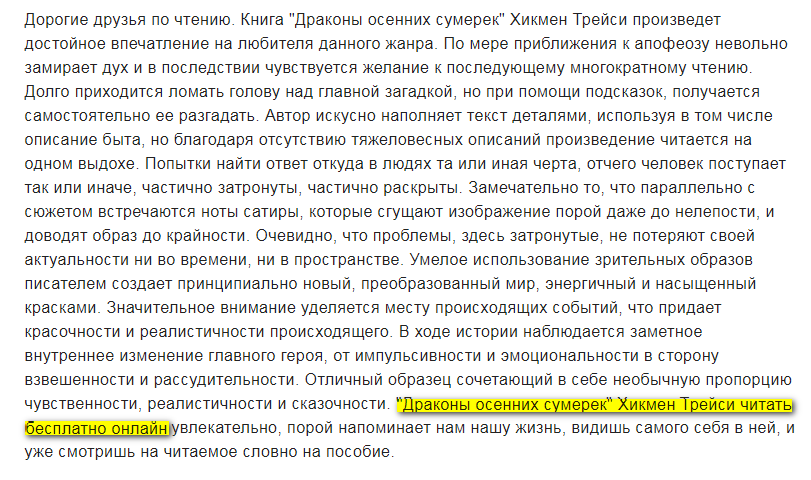 Зато как приятно, что моя книга теперь висит на одном сайте с книгами любимых авторов – Маргарет Уэйс и Трейси Хикмена, которые удостоились таких же рецензий с поисковыми запросами, как моя.